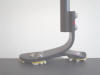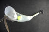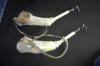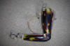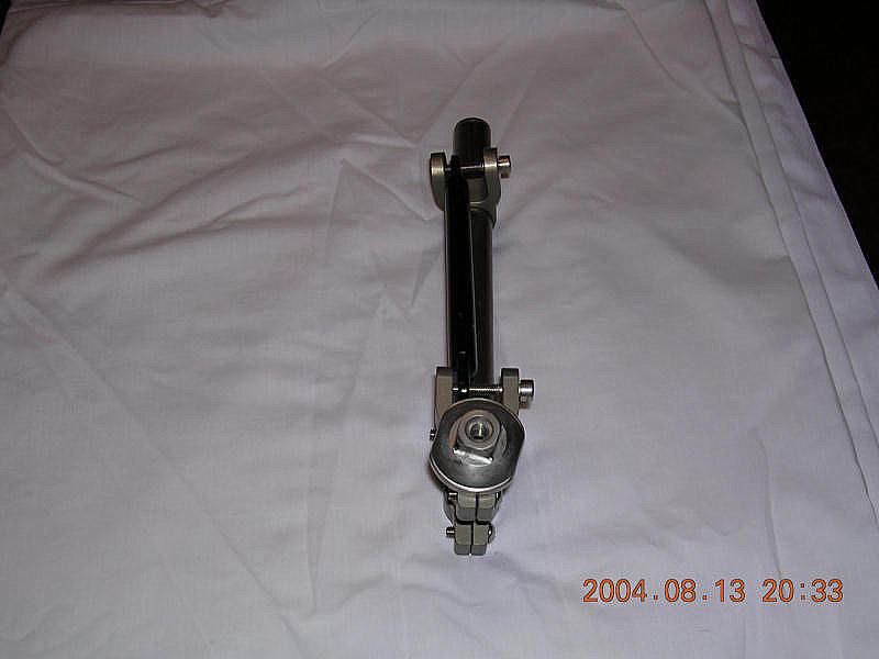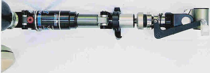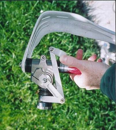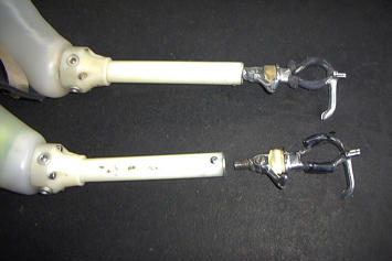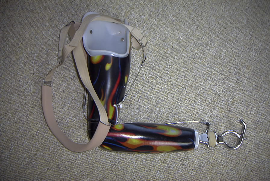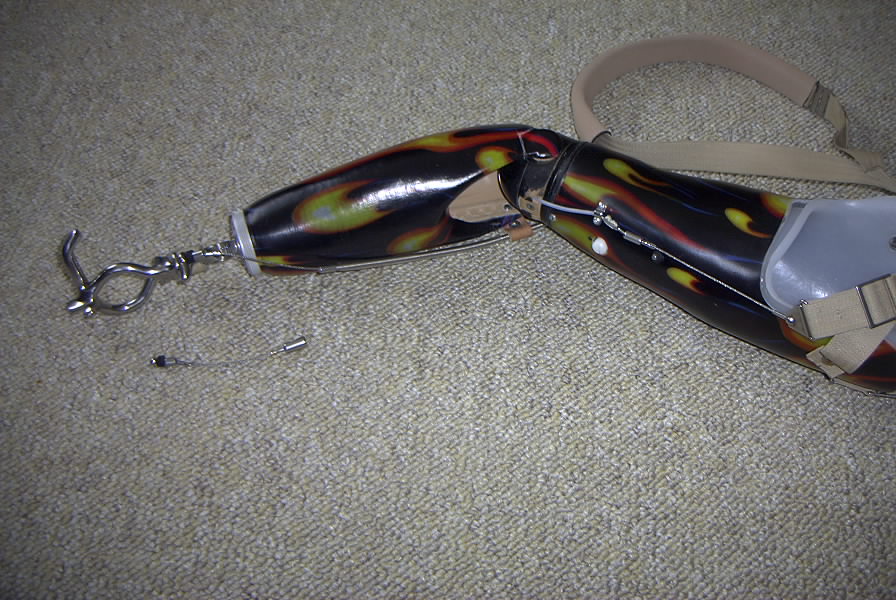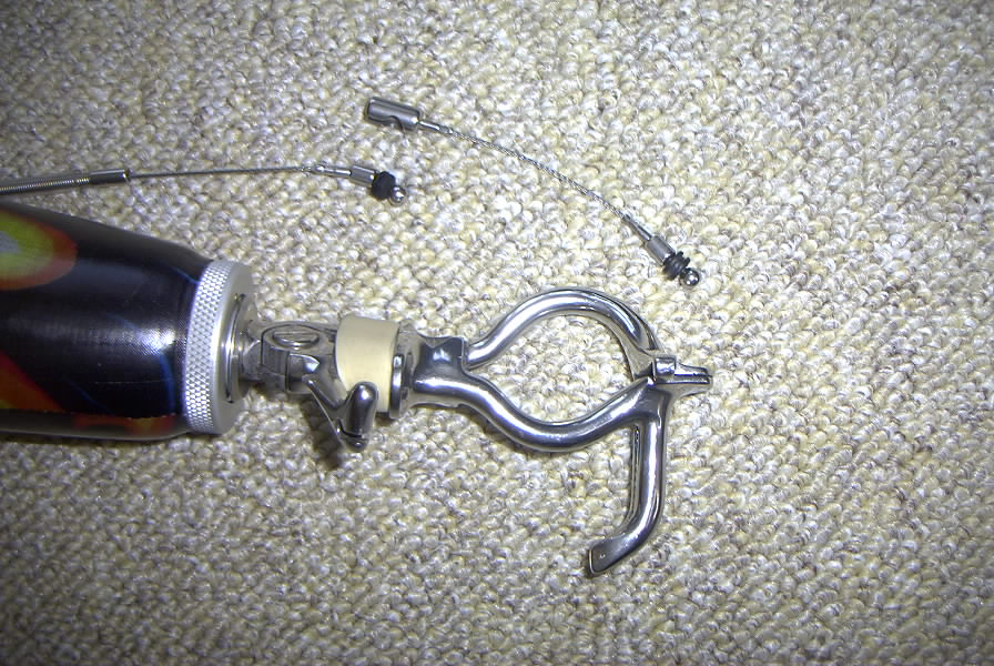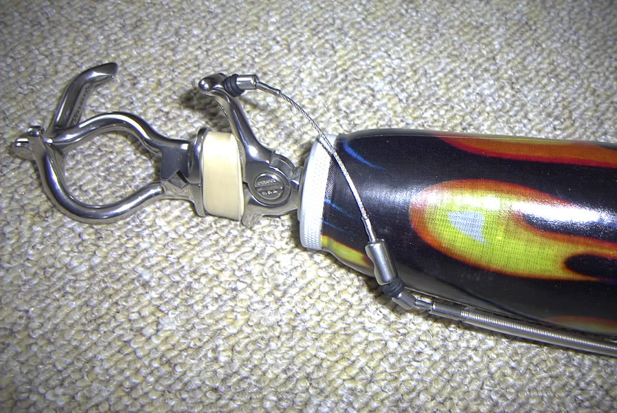 Prosthetic Arm Modifications for Bike Riding.The following two pictures show the first & second generation dedicated riding arm. The top arm depicts the first generation arm. Both designs feature "Seattle Mind" socket mounting adaptors. The adaptors are actually leg-knee components. The adaptor is attached to the upper socket with screws, then secured with epoxy glue. The upper sockets are simple clear plastic test socket material, that is properly fitted & moulded.Click On Picture To Enlarge.The hook-terminal I prefer is a basic working all-purpose model made by Dorrance. You can easily adjust the grip strength by adding or subtracting elastic bands. (I prefer a death-grip) The hook-terminal attaches to a "Endo-skeletal Delryn Pylon" via a standard terminal adaptor. The adaptor must be inserted with glue into the pylon then secured with screws through the pylon wall.Click On Picture To Enlarge.The second generation arm is a special "slip- socket" design that features two sockets, an outer & inner. The inner socket slides up & down to a maximum of 1/2 inch. This allows for more freedom of movement as well as protection & shock absorption via a tennis ball.Click On Picture To Enlarge.Since there are no controls for this arm, all you need is a basic sturdy back harness. ( Double up the strap & use stainless steel rivets)Click On Picture To Enlarge.You can see by this picture how the hook-terminal clamps on to the handle bar.Click On Picture To Enlarge.0==0==0==0==0The following pictures feature a modified conventional prosthetic arm that was made by Bryan Mitchell of. Mitchell Prosthetic & Orthotic Services Ltd. The modifications were made for both safety and comfort.Click on pictures to enlarge.The arm features basic standard controls with only minor modifications which include a set screw at the base of the upper socket that secures the elbow turntable and prevents it from twisting or turning. Other modifications include a cable extension which allows you to rotate the hook without adversely affecting the control harness and an elbow control lockout device which allows you to lockout the elbow by simply detaching the control cable.0==0==0==0==0I would like to acknowledge and thank Bryan Mitchell of B.D. Mitchell Prosthetic & Orthotic Services Ltd.. Bryan developed my first riding-arm after I broke both of my regular prosthetic arms in my first dual-slalom race in 1993. In 1999, Bryan co-designed the second generation arm, along with a student / apprentice. For more information, Bryan can be contacted at: B.D. Mitchell Prosthetic & Orthotic Services Ltd., 1175 Duffern Crescent, Nanaimo BC, Canada, v9s 2b5. Phone: (250) 754-1442 or Fax: (250) 754-3300 or you can visit their website at: Mitchell Prosthetic & Orthotic Services Ltd0==0==0==0==0The following custom arm & hand were built and designed by William Craig who is featured on the Arm Amputee page. The arm features a fox racing shocks and a releasable grip.Click on photos to enlarge.If you would like to see more prosthetic arm modifications visit William Craig's website: www.prostheticarm.com0==0==0==0==0The following pictures were contributed by Bruce Chatwell who is featured on the Motorcycle Amputee page and has been an above left elbow amputee for over 36years. Bruce has logged thousands of miles on both his Harley Davidson motorcycle and his 600 Mountain Cat snowmobile, using the arm featured below.Click on photos to enlarge.The pictures also show how Bruce operates the clutch by resting his arm on the bar and pulling the clutch backwards. For more information you can email Bruce at: bchatwell@collinscom.net or to see Bruces' right hand snowmobile brake modification visit the Snowmobile Amputee page.0==0==0==0==0The following pictures and information were contributed by Jon Rayeski. Here is what Jon has to say: I